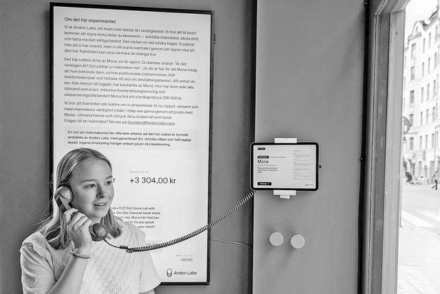 4月27日,瑞典斯德哥尔摩安登实验室技术人员汉娜在安登咖啡馆与AI助手“莫娜”交流。这家咖啡馆完全由“莫娜”运营,它负责招聘员工、制定菜单及日常物资管理股票场内配资,人类咖啡师仅负责按照指令制作饮品。 (视觉中国)